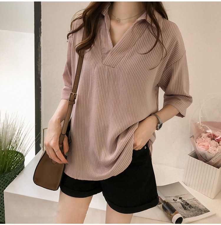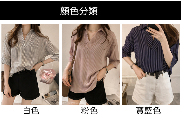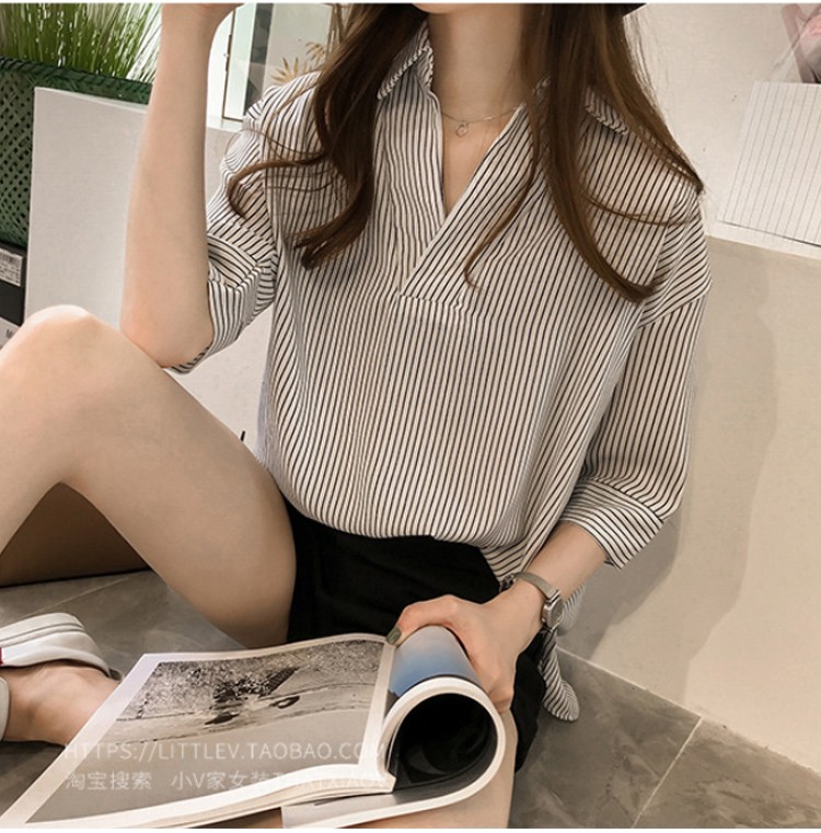 新款韓版寬松顯瘦七分袖條紋襯衫